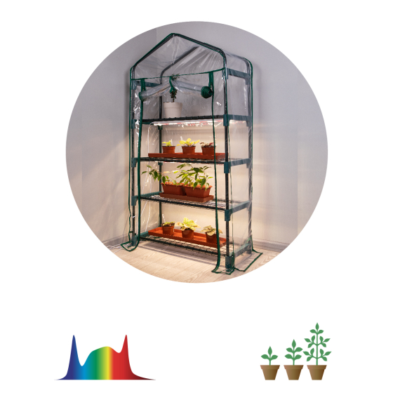 Для подсветки каждого яруса теплицы ЭРА FITO-House-4 в комплекте поставляются 3 фитосветильника красно-синего спектра ЭРА FITO-9W-Т5-N. В них использованы давно зарекомендовавшие себя светодиоды Nationstar. Свечение фиолетовое - оно абсолютно безопасно для человека и животных, при этом сверхэффективно для роста и развития растений .