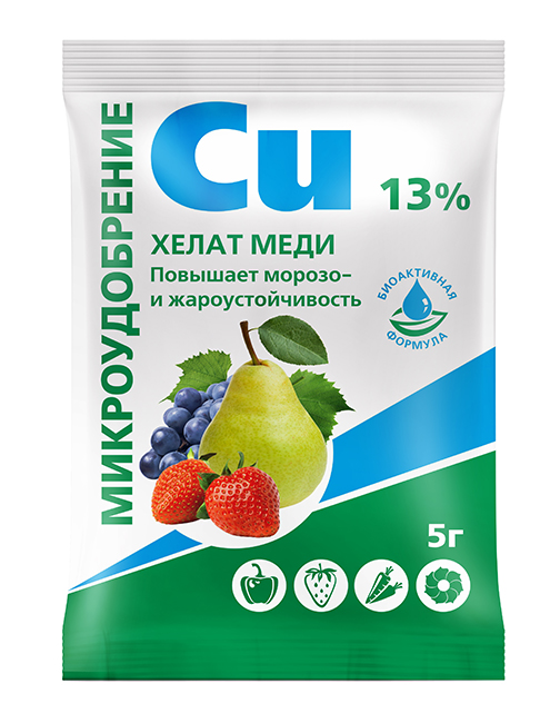 Высокоэффективное экологически чистое водорастворимое микроудобрения в биологически активной форме, применяется для профилактики и лечения болезней и хлороза вызванного дефицитом меди у плодово-ягодных, овощных и декоративных культур в теплице и открытом грунте.