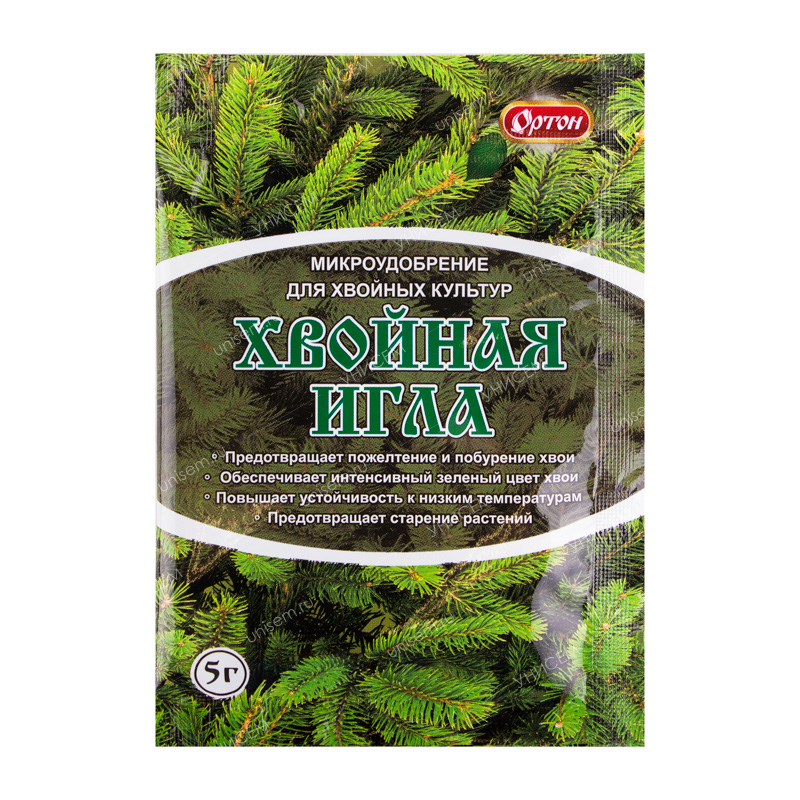 Ортон Хвойная игла – микроудобрение для хвойных культур. Применяется в качестве корневой и внекорневой подкормки для хвойных культур (ель, сосна, можжевельник, туя и другие). Препарат предотвращает пожелтение и побурение хвои, обеспечивает интенсивный зеленый цвет, предотвращает старение растений, повышает устойчивость к низким температурам и заболеваниям, вызванным недостатком какого-либо микроэлемента.