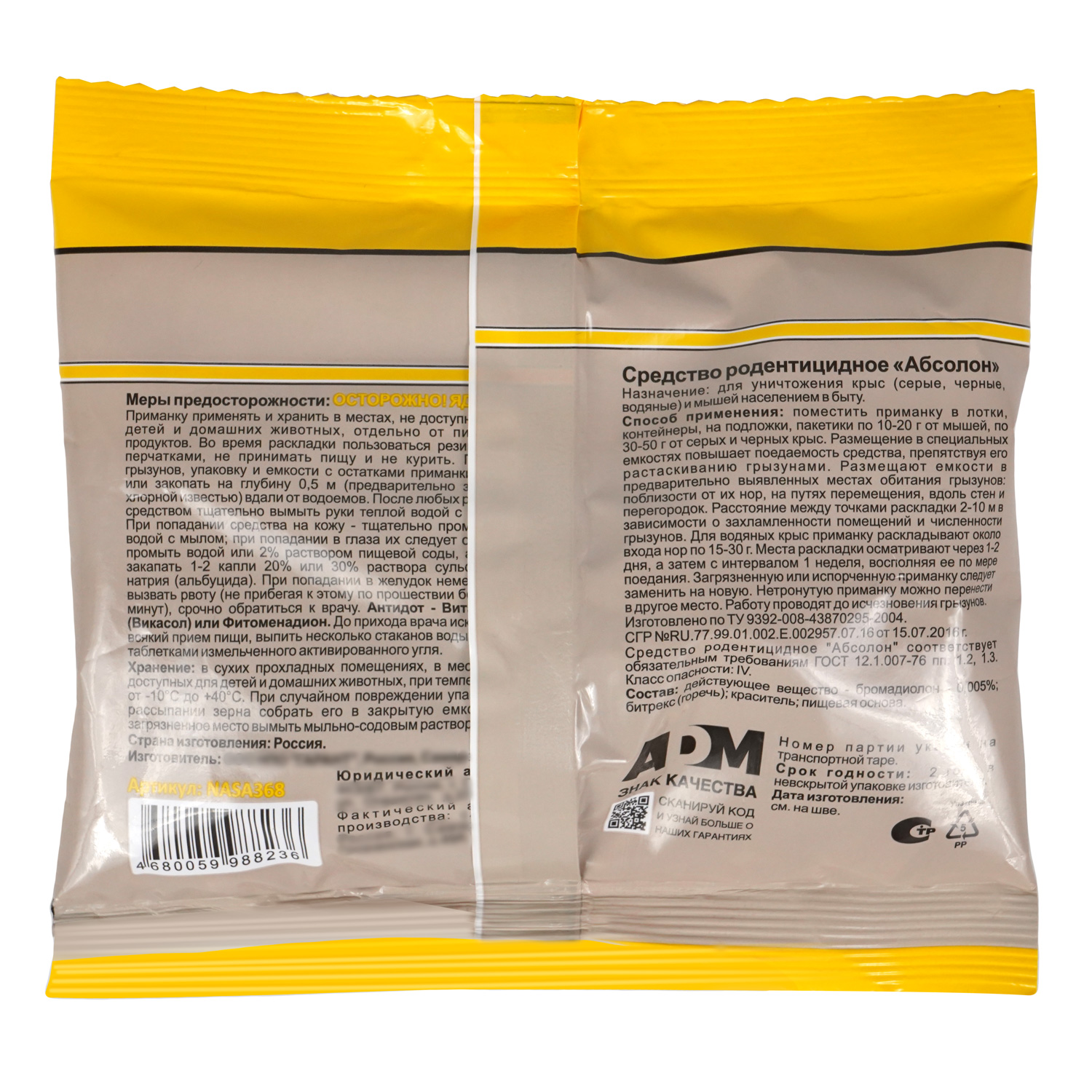 Состав: бромадиолон (0,005%), красители, пищевая основа и битрекс (горький компонент). Бромадиолон — мощный родентицид из второго поколения, который обладает более высокой эффективностью и способностью накапливаться в печени отравленного животного. Обладает кожно-резорбтивным и антикоагулянтным действием.