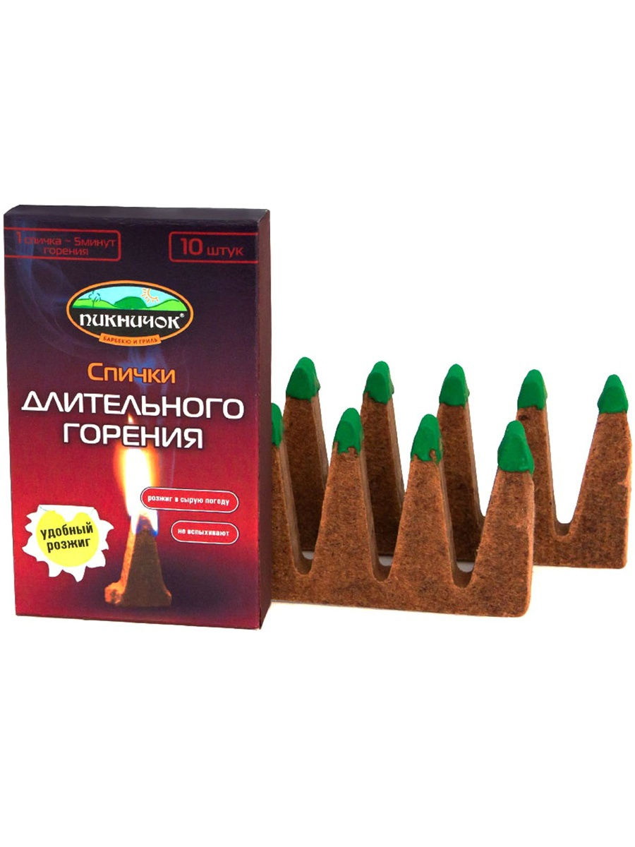 Безопасное средство для розжига, сделанное по принципу «2 в 1». Средство зажигается как обычные спички, поскольку каждый «зубчик» имеет зажигательную головку, а на коробочке есть полоска для разжигания. Треугольная форма «зубчиков» позволяет легко отламывать их от плитки.