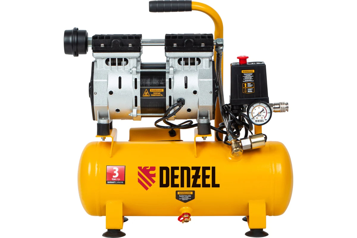 Безмасляный малошумный компрессор Denzel DLS650/10 58021 мощностью 650 Вт и производительностью 120 л/мин, с ресивером на 10 л, подходит для бытового использования, а также будет полезен в автосервисах, на строительных площадках и при производстве мебели. Генерация сжатого воздуха происходит без масла и не наносит урон экологии. На выходе не нужно иметь дело с масляным туманом, что очень важно при проведении малярных работ. К компрессору могут быть подключены краскопульты, пневмограверы и пневмонейлеры, простые пневмоинструменты для подкачки шин, продувки техники или отдельных деталей.