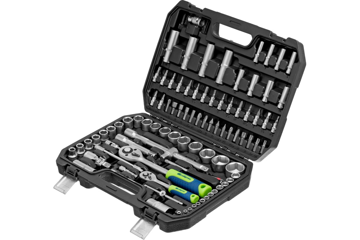 Набор инструментов Сибртех 13388 упакован в пластиковый кейс и состоит из 94 предметов с присоединительным размером 1/2" и 1/4", предназначенных для монтажа и демонтажа резьбового крепежа с разными типами шлицев