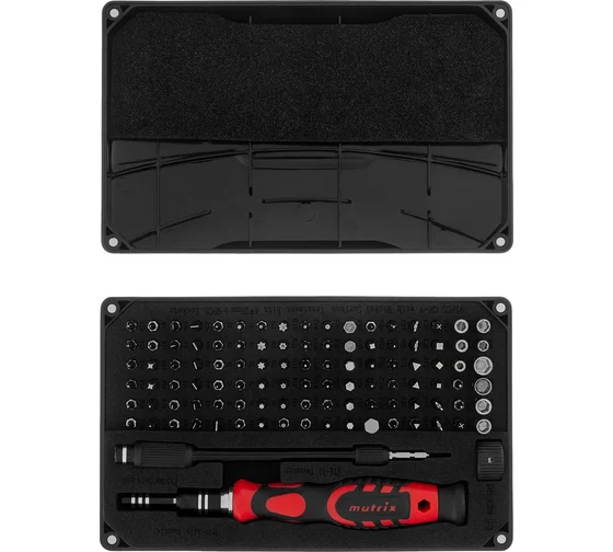 Набор для точных работ включает в себя 93 биты, 9 торцевых головок, телескопический и гибкий удлинители, намагничиватель-размагничиватель бит, отвертку и пинцет с защитным колпачком. С его помощью можно отремонтировать очки, игрушки, портативную и бытовую технику и т.д. Выдвижной стержень, гибкий удлинитель и пинцет позволяют работать с мелкими деталями в углублениях и труднодоступных местах.