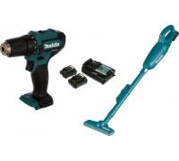 Набор инструментов Makita CXT CLX226X1 включает в себя дрель-шуруповерт DF333DZ, пылесос CL106FDZ, 2 аккумулятора BL1016 и зарядное устройство DC10WD.