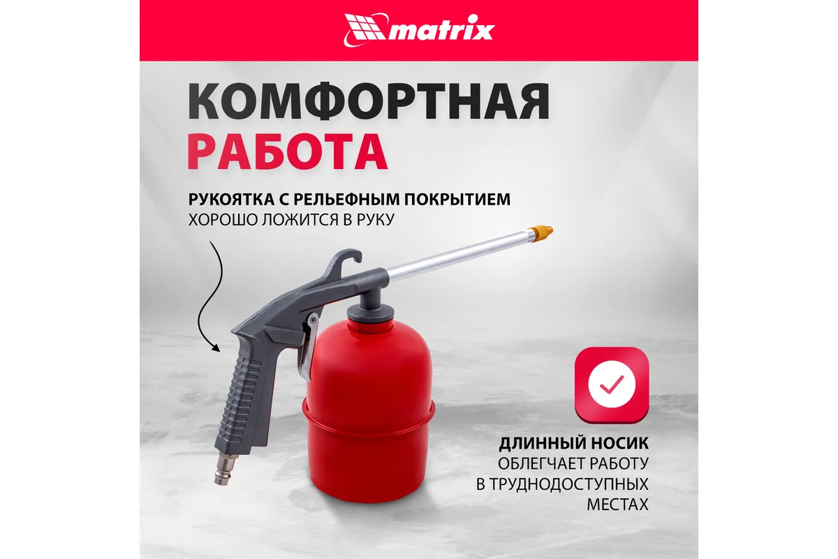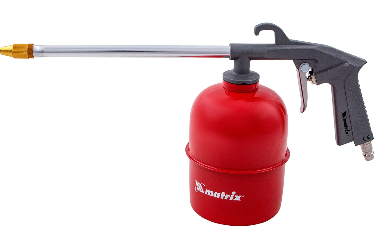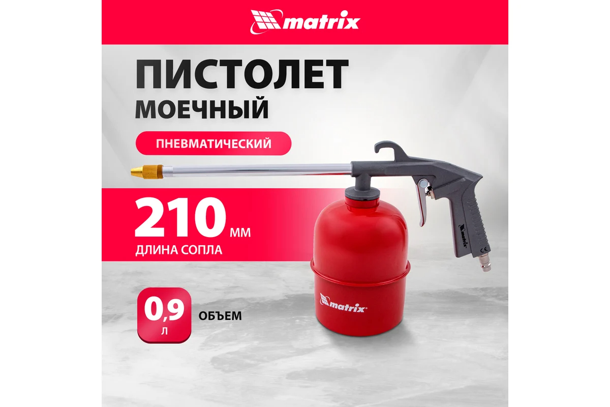 Пневматический моечный пистолет MATRIX 57340 предназначен для чистки различных поверхностей от загрязнений. Длинное узкое сопло позволяет работать в труднодоступных местах. Благодаря принципу работы на сжатом воздухе пистолет имеет высокий рабочий ресурс и способен непрерывно работать в течение продолжительного времени.