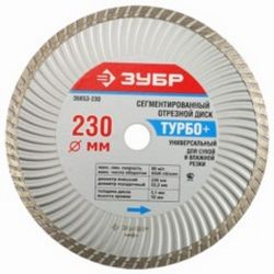 Отрезной сплошной диск ЗУБР используется в углошлифовальной машине для осуществления разрезания (с помощью специальной охлаждающей жидкости и сухой) гранита, кирпича, камня, бетона, мрамора и других строительных материалов. Не рекомендуется применять диск для осуществления разрезания или шлифовки металлов. Данная модель разделена на сегменты, включающие в себя компенсационные отверстия, распределенные по всей окружности. Сегментный диск осуществляет эффективную работу без необходимости охлаждения алмазного слоя. Рекомендуемое время непрерывной работы составляет от 60 до 90 секунд, после этого необходимо выполнять охлаждение диска на холостом ходу не меньше, чем 20 секунд. Направление вращения диска обязательно должно соответствовать направлению стрелки. Выполняя несколько одновременных резов по однородному абразивному материалу можно восстановить режущую способность диска, если он засалится. Данная модель предоставляет возможность выполнять чистый рез без сколов как при помощи охлаждающей жидкости, так и сухим резом.