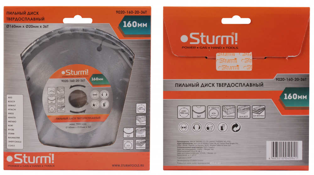 —9020-160-20-36T Пильный диск, размер 160х20x36 зубьев С ПЕРЕХОД. КОЛЬЦОМ НА 16мм Sturm!