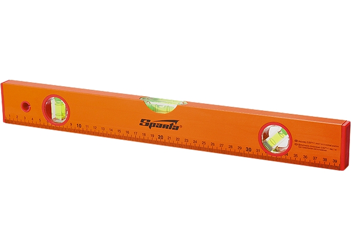 Корпус уровня изготовлен из прямоугольного анодированного алюминиевого профиля. Вес погонного метра – 0,17 кг. Имеет анодированное покрытие. Пластмассовые заглушки на обоих концах. Модель имеет три акриловых глазка для проверки отклонений по горизонтали, вертикали и под углом 45 градусов. Точность измерений – 1 мм м (0,057 градуса).