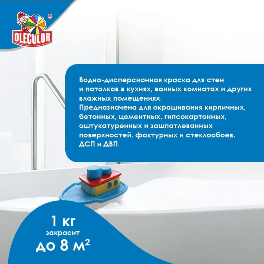 Водно-дисперсионная краска для стен и потолков в кухнях, ванных комнатах и других влажных помещениях. Предназначена для окрашивания кирпичных, бетонных, цементных, гипсокартонных, оштукатуренных и зашпатлеванных поверхностей, фактурных и стеклообоев, ДСП и ДВП.