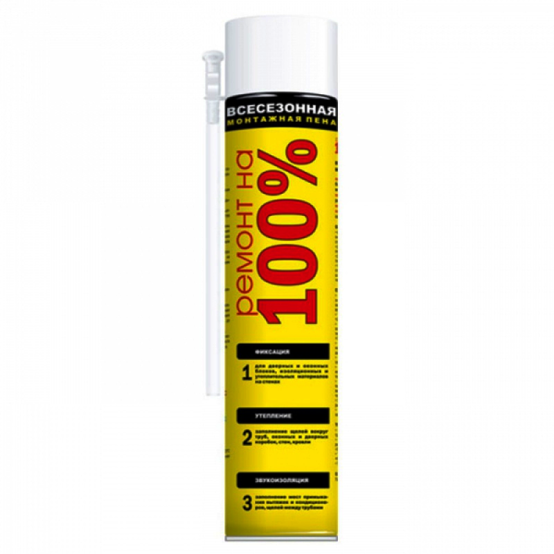Всесезонная пена Ремонт на 100% R100BCJ0058 обладает хорошей адгезией. Может использоваться без монтажного пистолета, для этого в комплекте идет специальный аппликатор. Пена служит для фиксации изоляционных и утеплительных материалов на стенах.