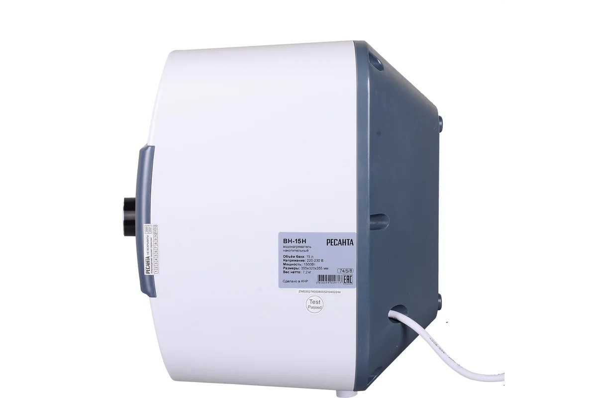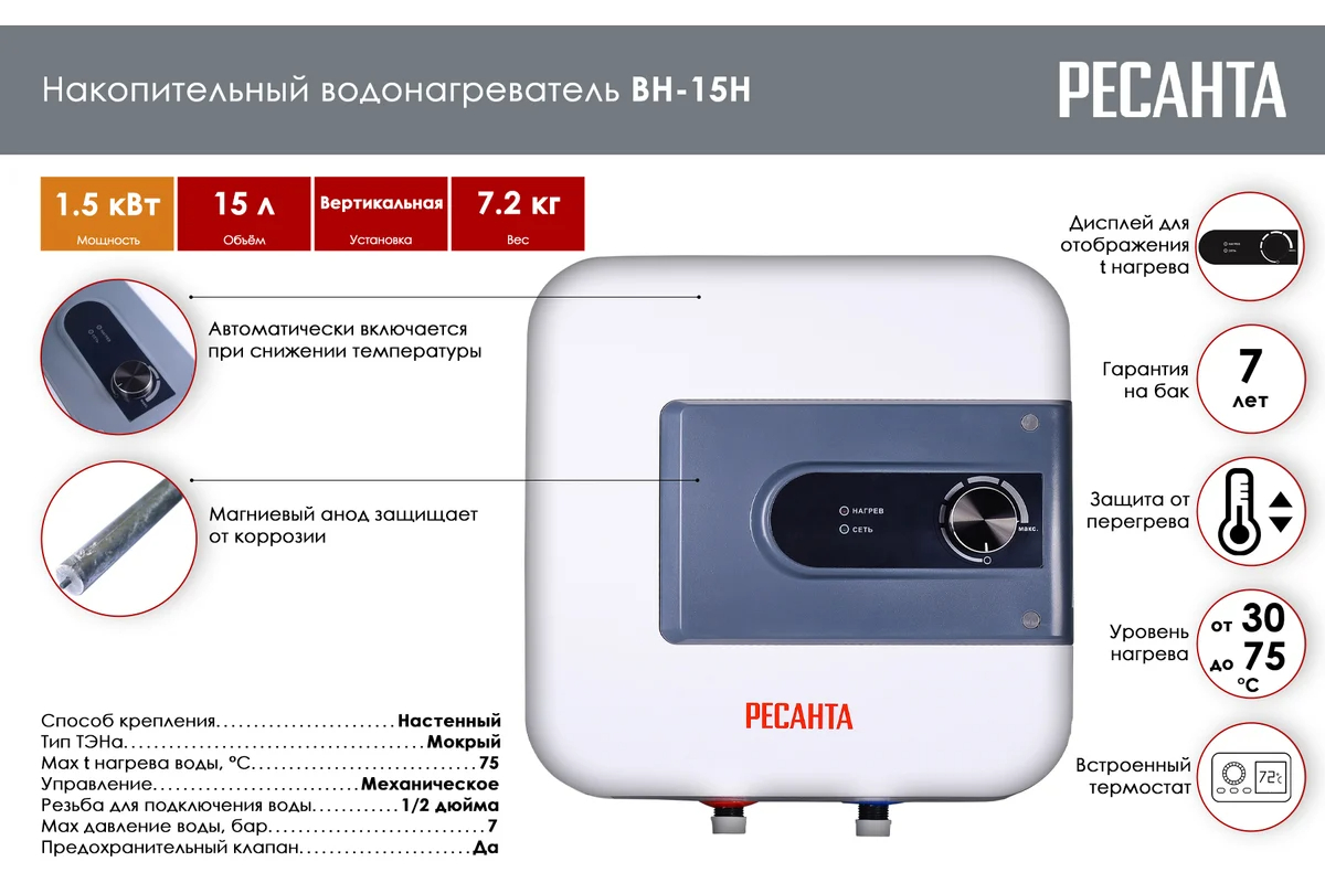 Компактный накопительный водонагреватель Ресанта ВН-15Н устанавливается над точкой водопотребления. Патрубки для труб холодного и горячего водоснабжения расположены внизу бака. Бойлер рассчитан на 15 л воды, что достаточно для 1 человека или небольшого потребления на семью. Полный бак нагревается до 75°C за 31 мин. Желаемую температуру воды можно задать с помощью ручки терморегулятора. Термостат автоматически ее поддерживает. Надежная теплоизоляция корпуса не дает нагретой воде охлаждаться.