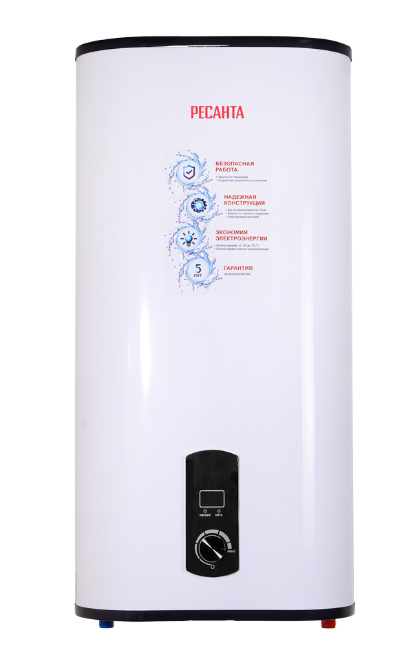 Ресанта ВН-50У предназначена для быстрого нагревания холодной воды, поступающей из центрального водопровода, в квартирах и частных домах. Объема бака в 50 л достаточно для удовлетворения бытовых нужд семьи из 2-3 человек. Бойлер оснащается цифровым дисплеем на передней панели для визуального контроля текущей температуры, а ее регулировка выполняется с помощью удобного поворотного механизма. При достижении порога в 75°C срабатывает защита от перегрева и выполняется автоматическое отключение устройства.