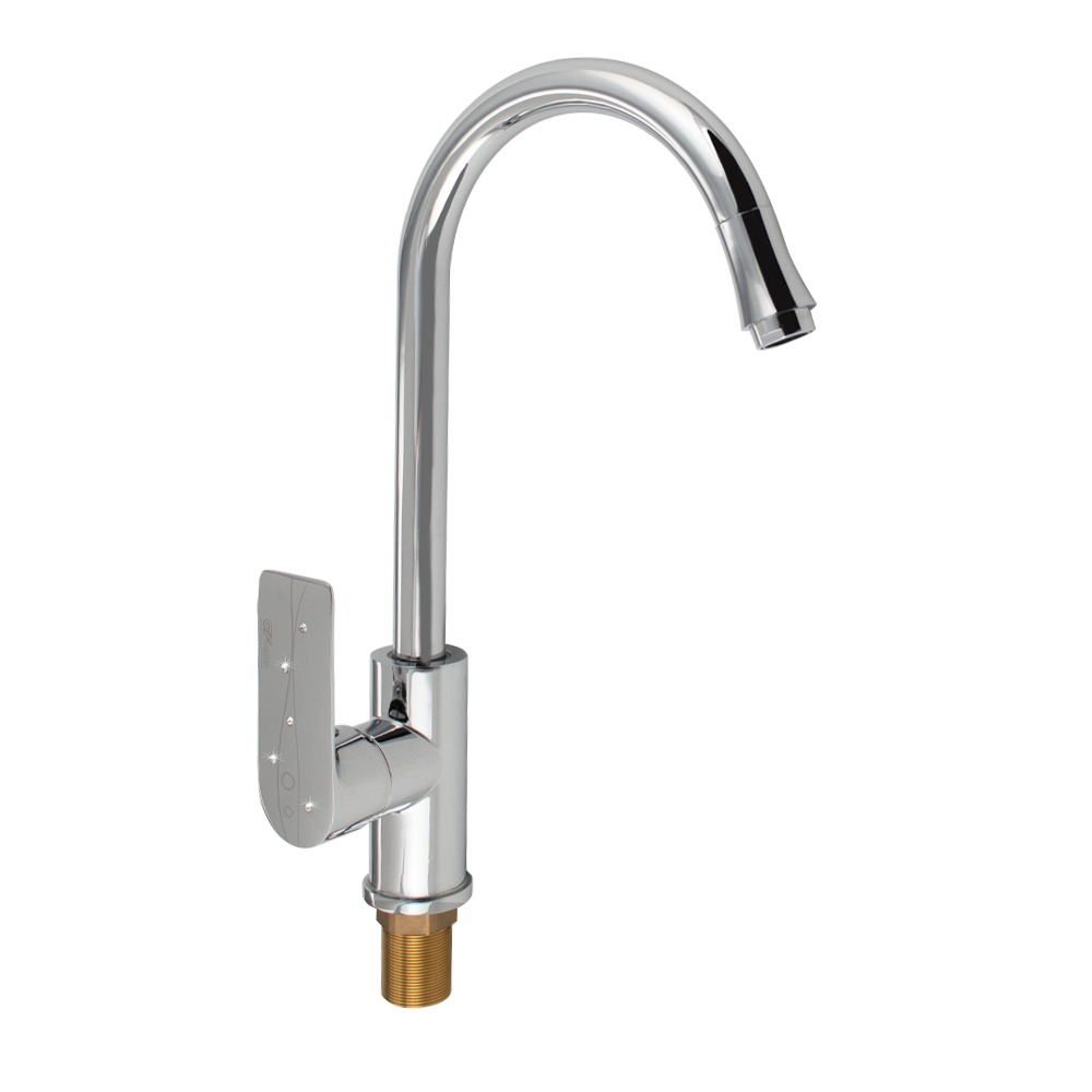 Смеситель для кухонной мойки и раковин, хромированный, боковой, с высоким С - образным изливом, шаровый. Крепление резьба - гайка, картридж d = 35 мм, литая ручка с пятью стразами. Аэратор для экономии воды. Габаритные размеры: высота 370 мм, длина 220 мм, диаметр посадочного седла 50 мм, длина резьбы 50 мм, длина подводки 500 мм.