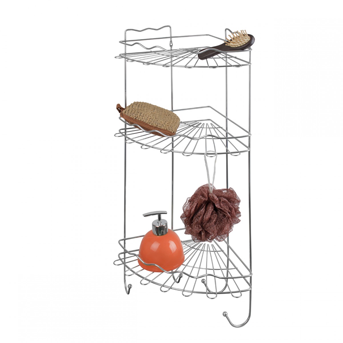 Полка для ванной - угловая 3-х ярусная из сталь с хромированным покрытием. Компактная и удобная этажерка крепится к стене и имеет 4 крючка для полотенец или мочалок. 3 яруса позволят разместить большое количество шампуней, гелей для душа, а также другой косметики, в том числе в высоких флаконах. Оригинальный дизайн в виде волны и функциональность порадуют любую хозяйку.
