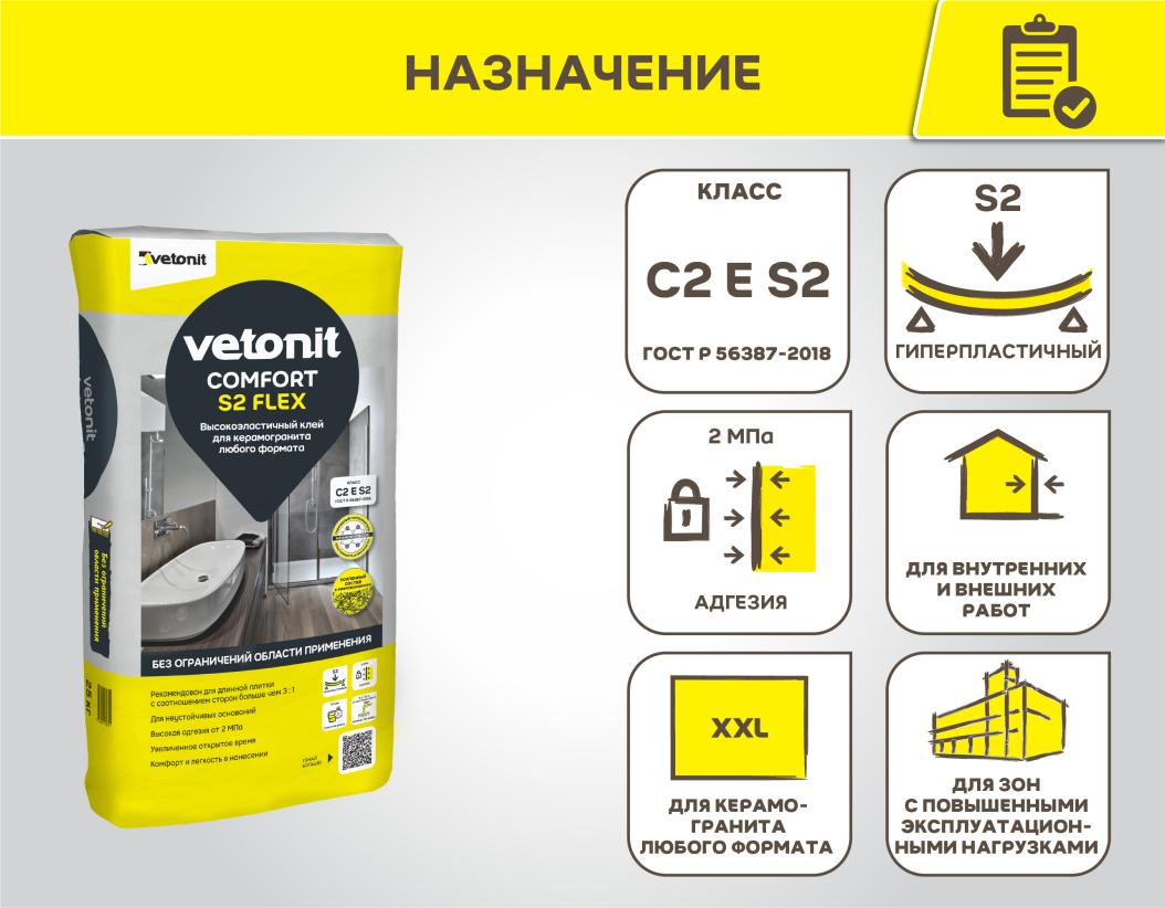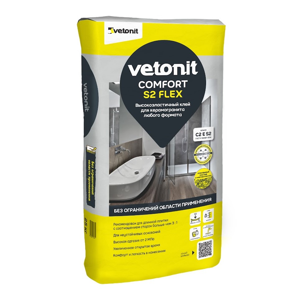 Vetonit Comfort S2 Flex - высокоэластичный клей класса ГОСТ(Р 56387-2018) С2 E S2 с армирующим волокном для керамогранита любого формата. Идеален для керамогранита размера 2 х 2 м, 3 х 3м. Для стен и полов внутри и снаружи зданий. Нивелирует вибронагрузки и динамические нагрузки - подходит для зон с повышенным трафиком: входные группы, общественные помещения, вибронагрузки и динамические нагрузки.