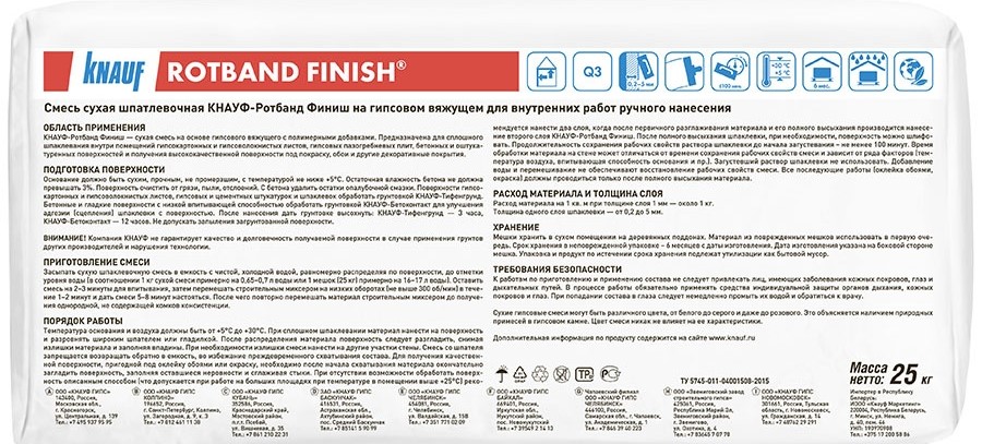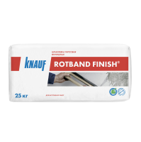 Knauf Rotband Finish - сухая шпаклевочная смесь для внутреннего применения на основе гипсового вяжущего с полимерными добавками. Предназначена для шпаклевания тонким слоем бетонных поверхностей, гипсокартонных и гипсоволокнистых листов, пазогребневых плит, гипсовых и цементных штукатурок и получения высококачественной поверхности под покраску, обои и другие декоративные покрытия. Не применять для заделки стыков гипсокартонных и гипсоволокнистых листов.