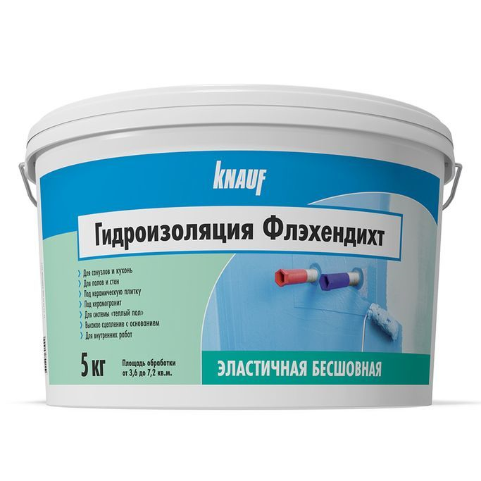 - создания водонепроницаемой, эластичной гидроизоляции перед укладкой покрытий из керамической плитки и природного камня (в сочетании с лентой КНАУФ-Флэхендихтбанд и плиточными клеями на цементной основе, например, КНАУФ-Флекс), в том числе, и при устройстве обогреваемых полов и стен.