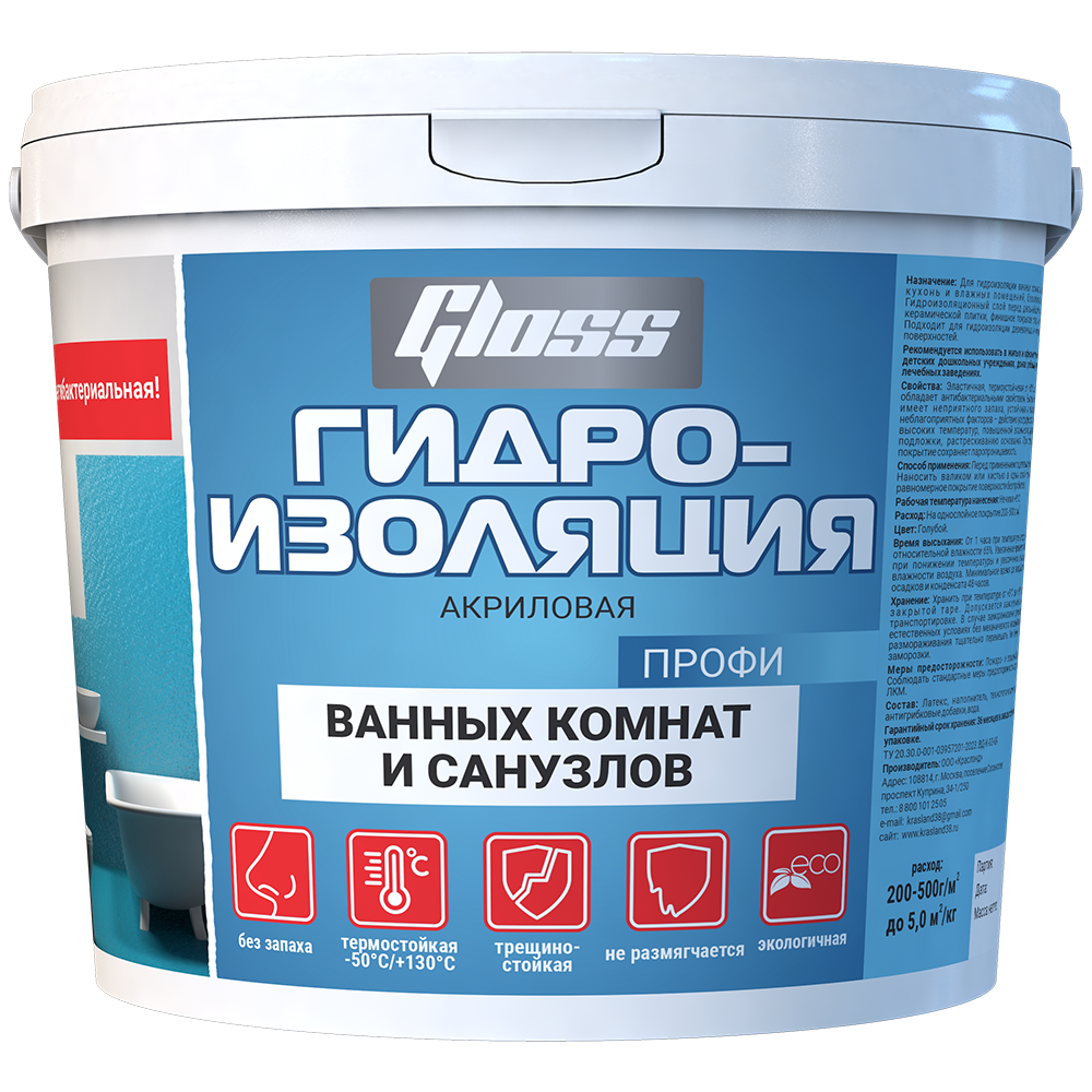 Для гидроизоляции ванных комнат и санузлов, кухонь и влажных помещений, бассейнов и саун. Гидроизоляционный слой перед дальнейшей укладкой керамической плитки, финишное покрытие стен и потолков. Подходит для гидроизоляции деревянных и минеральных поверхностей.