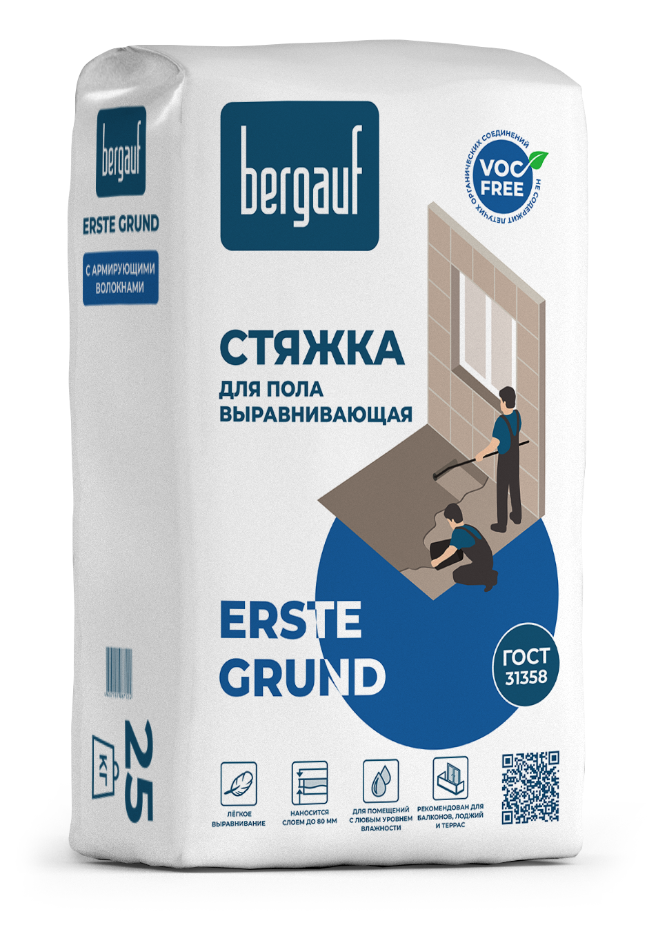 *- выравнивающая стяжка Erste Grund рекомендована для балконов, лоджий и террас, а так же для помещений и открытых участков со значительными сезонными изменениями температуры окружающей среды. Возможность использования продукта при прочих наружных работах необходимо уточнить у технического специалиста Bergauf в Вашем регионе.