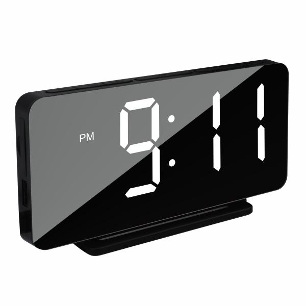 Часы электронные светодиодные с радио и будильником, дисплей с зеркальной поверхностью, белая светодиодная подсветка, 3 уровня яркости, выбор часового формата: 12/24 часа, радио (FM 87 ~ 108 МГц), будильник с функцией автоповтора (каждые 5-60 мин.), встроенный элемент питания 1*CR2032 (для сохранения настроек в случае отключения питания).
