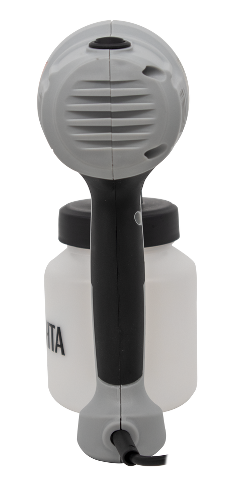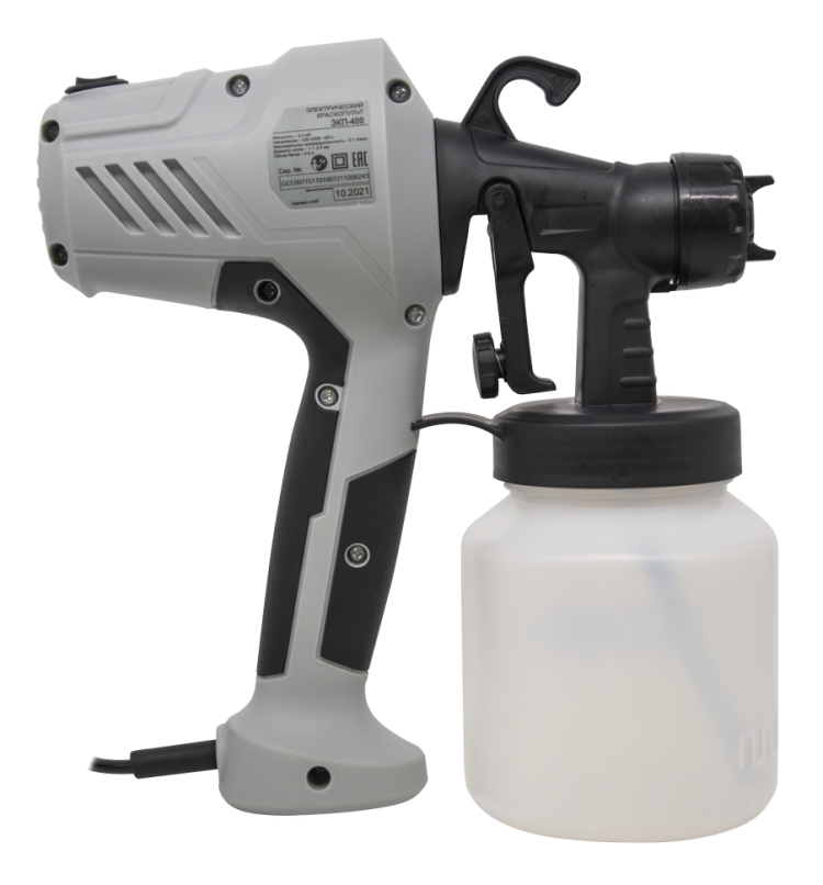 Использование воздушного компрессора позволяет добиться высокого качества покраски, стабильная подача сжатого воздуха позволит нанести любой растворимый лакокрасочный материал ровным тонким слоем даже на неровную поверхность. Благодаря системе распыления HVLP, минимизируются потери ЛКМ на «туманообразование», что обеспечивает более экономичный расход. В комплектацию краскопульта электрического входят 2 сопла диаметрами 1,7 и 2,5 мм, это дает возможность выбрать оптимальный вариант под нужный тип покраски. Устройство легко справляется с любыми ЛКМ, включая материалы высокой вязкости. Максимальная вязкость распыляемого ЛКМ составляет 80 DIN. Включение подключенного к розетке устройства обеспечивается путем нажатия на курок. 800-миллилитровый бачок для распыляемого вещества расположен в нижней части.