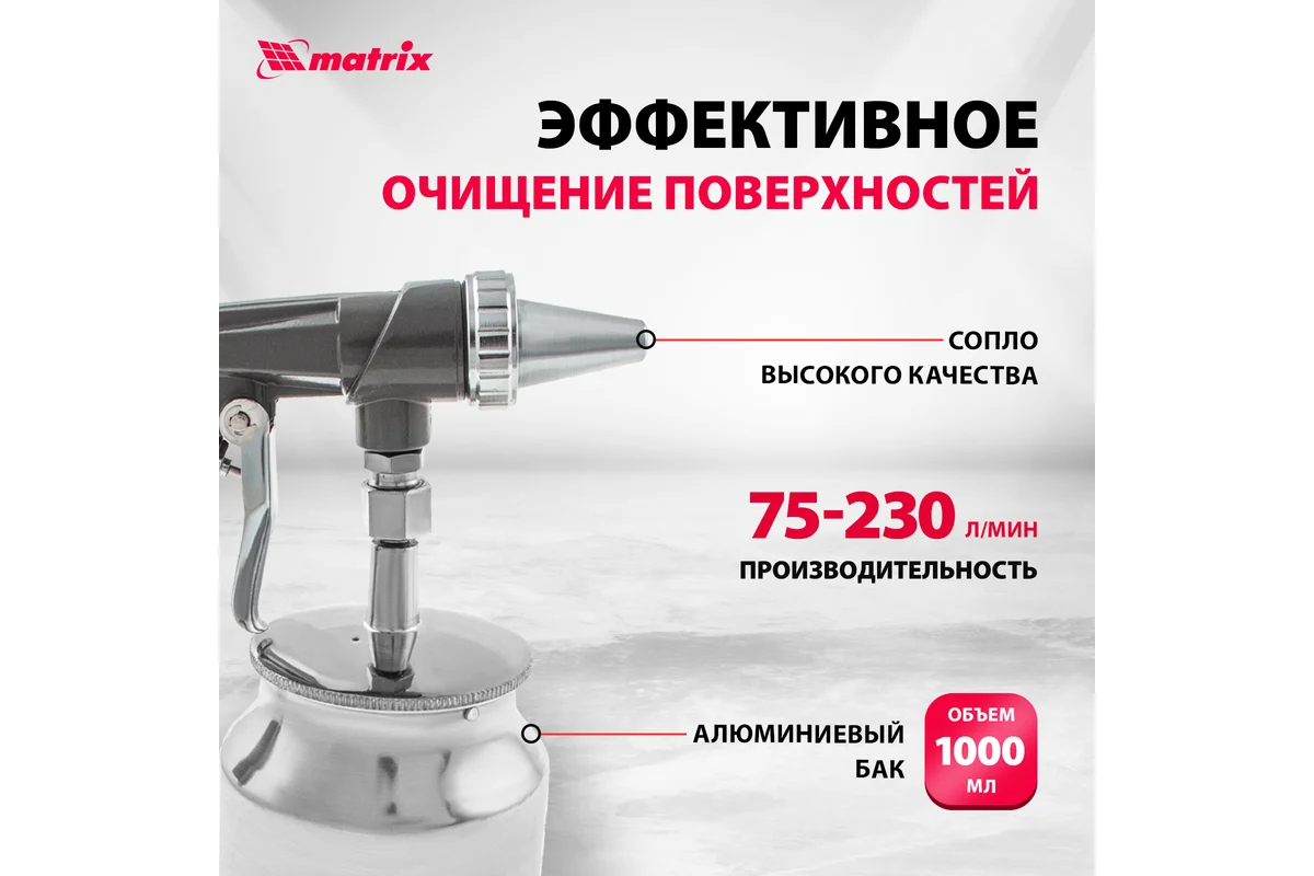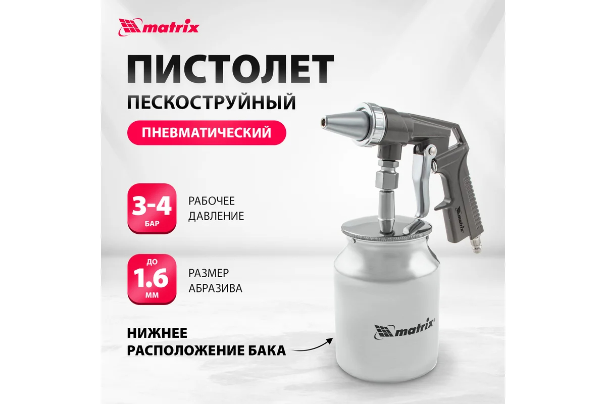 Пескоструйный пистолет MATRIX 57326 предназначен для очистки поверхности от грязи, ржавчины, краски, стойких загрязнений. Наличие бачка для песка исключает необходимость подключать дополнительный шланг для подачи песка. Для работы используется промытый кварцевый песок или специальная абразивная смесь.