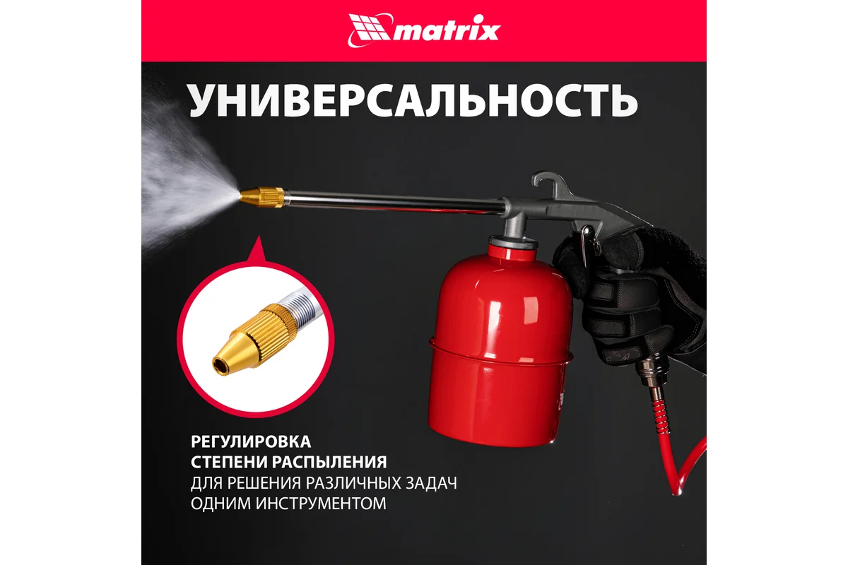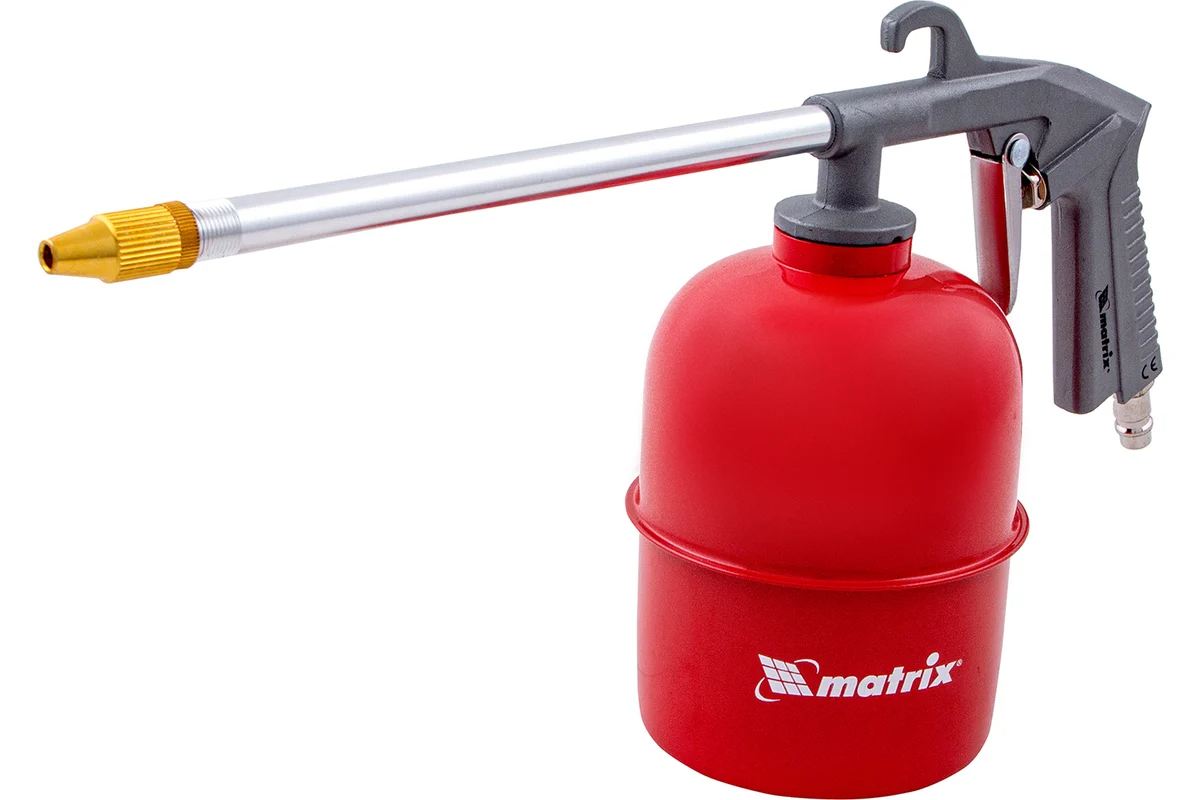 Пневматический моечный пистолет MATRIX 57340 предназначен для чистки различных поверхностей от загрязнений. Длинное узкое сопло позволяет работать в труднодоступных местах. Благодаря принципу работы на сжатом воздухе пистолет имеет высокий рабочий ресурс и способен непрерывно работать в течение продолжительного времени.