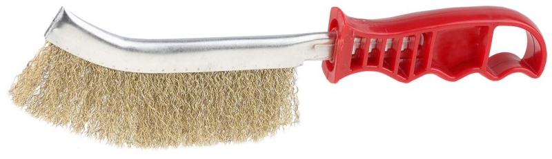 Щетка латунная с пластмассовой ручкой, 6 рядов. Основа щетки металлическая, рабочая часть состоит из одного ряда проволоки. Рукоятка эргономичная сделана из прочного пластика. Применяется для очистки поверхностей из металла. В основном применяется для снятия ржавчины и застарелой краски. Щетка очень удобна, а также позволяет использовать ее в узких местах.