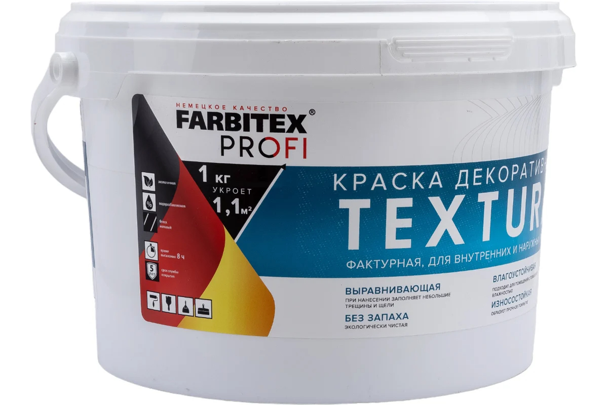 Супербелая акриловая краска с эффектом декоративной штукатурки. Позволяет легко моделировать разнообразные фактуры поверхности. Хорошо скрывает мелкие неровности. Предназначена для окраски кирпичных, бетонных, цементных, гипсокартонных, оштукатуренных и зашпатлеванных поверхностей, фактурных и стеклообоев, ДСП и ДВП.