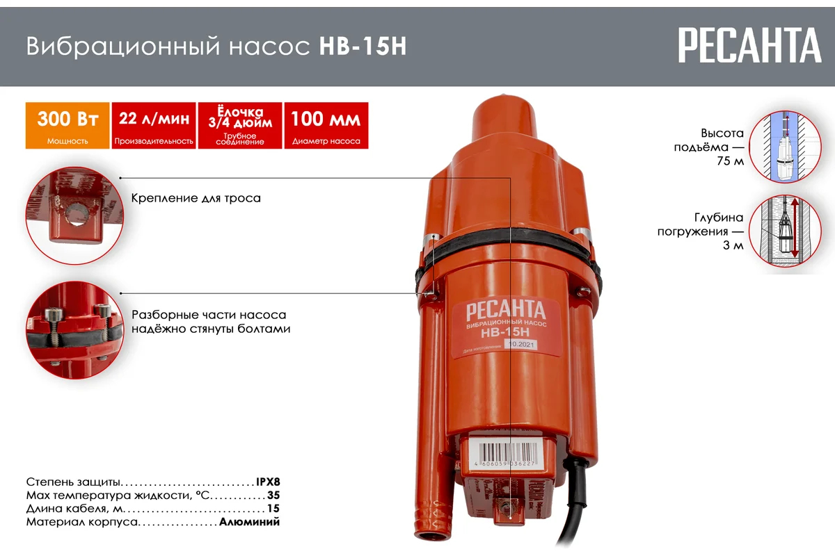 Вибрационный насос Ресанта НВ-15Н оснащен функцией защиты от перегрева. Корпус из алюминия отличается малым весом и быстро охлаждается в водной среде. Его разборные детали имеют надежное болтовое соединение. Максимальная температура жидкости, при которой устройство может использоваться без риска его перегрева и повреждения, составляет +35°C. Кабель длиной 15 м обеспечивает удобство подключения к сети.