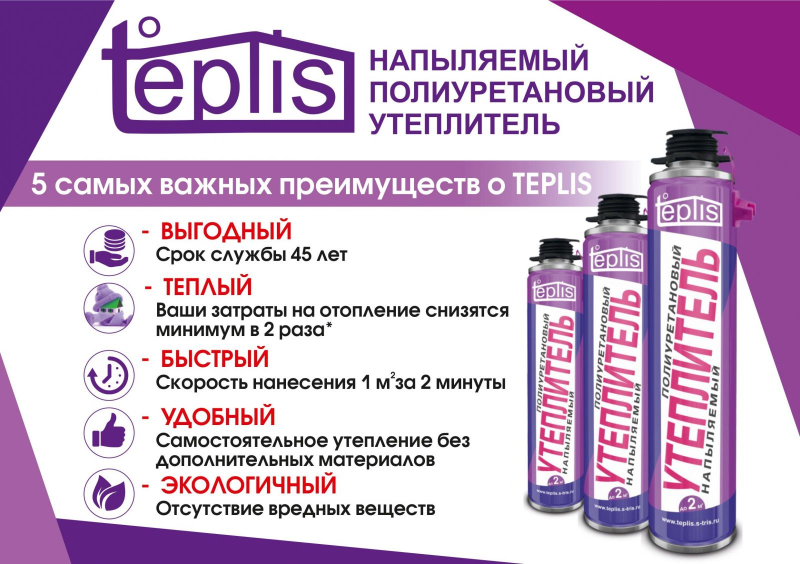 Пенополиуретановый утеплитель «TEPLIS» предназначен для теплоизоляции и звукоизоляции. «TEPLIS» удобен в использовании, эксплуатация не требует специальных навыков. Утеплитель экономичен по сравнению с выбором других строительных материалов предназначенных для теплоизоляции. Предоставляет отличную возможность изоляции труднодоступных мест и участков сложной формы. Напыляемый полиуретановый утеплитель позволяет надёжно и быстро утеплять любые участки в помещении или здании.